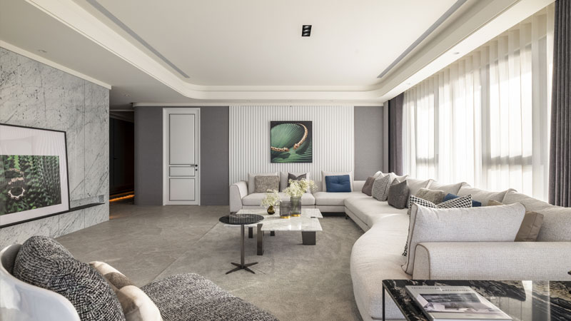 本案為單層大坪數住宅,門廳式玄關與客廳可雙向共享景觀陽台,其引景、借景優勢為入室第一眼底定恢弘深邃既視感,每一處環節都蘊含豐盈感官體驗。